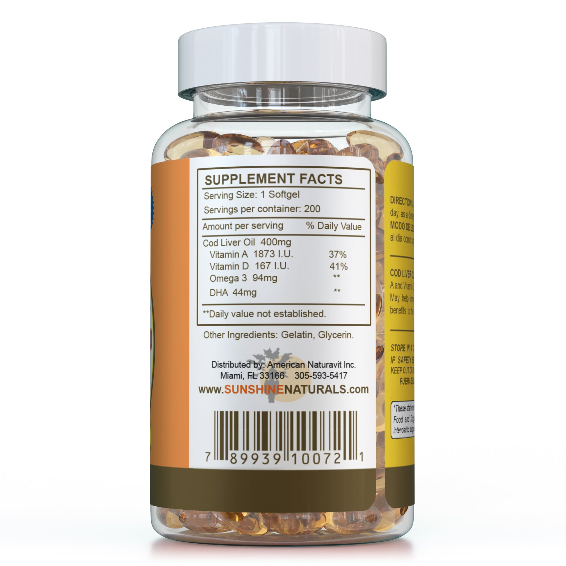 Experimente la fuerza del aceite de hígado de bacalao concentrado 1400 mg de Sunshine Naturals, su aliado diario para la vitalidad y el bienestar.
